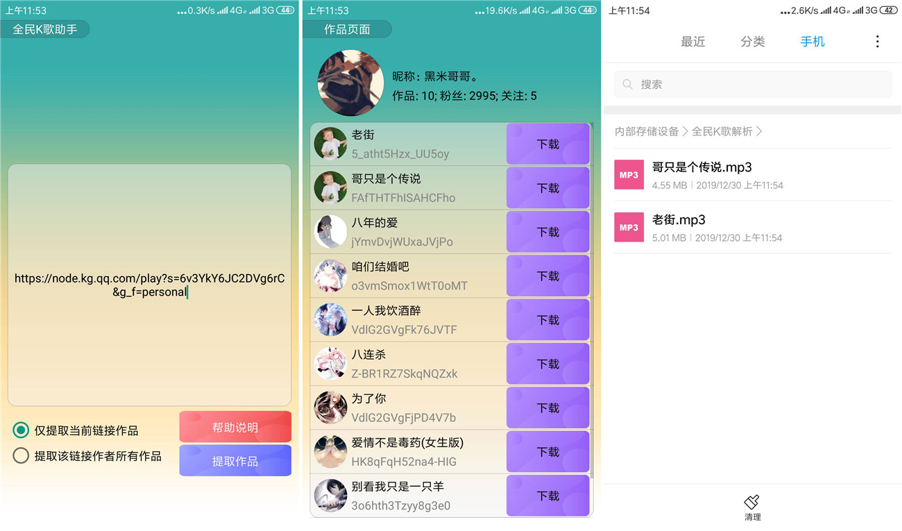 碰到喜欢的人唱的歌却无法下载怎么办?用全民K歌助手 一键解析下载作品音乐或Mv,并且支持解析下载指定用户全部作品。