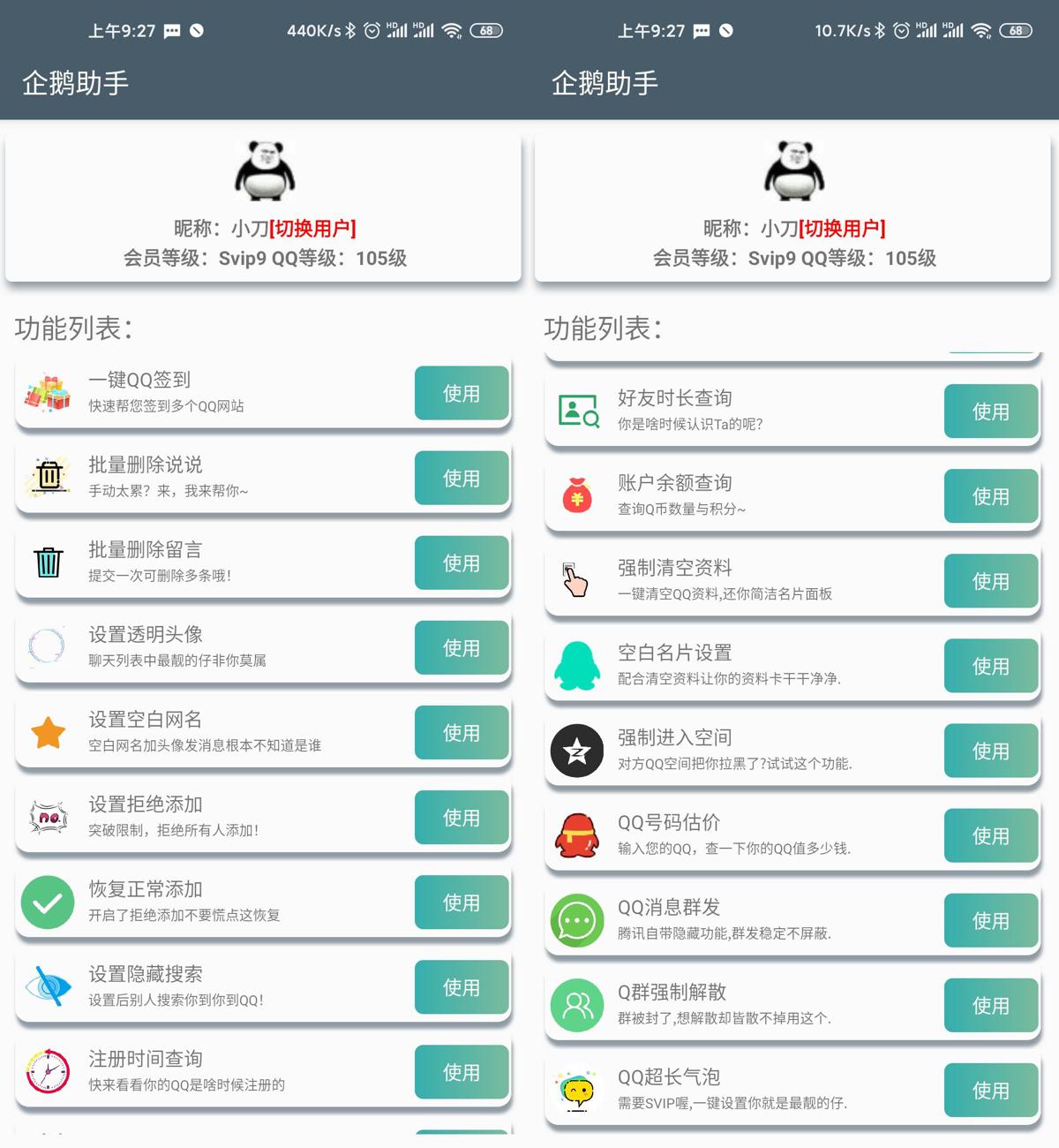 汇集了一键批量QQ签到、删说说留言、透明头像网名昵称、强制进空间等超多实用20项玩Q必备功能,一软在手,你就是好友列表中最靓的仔。