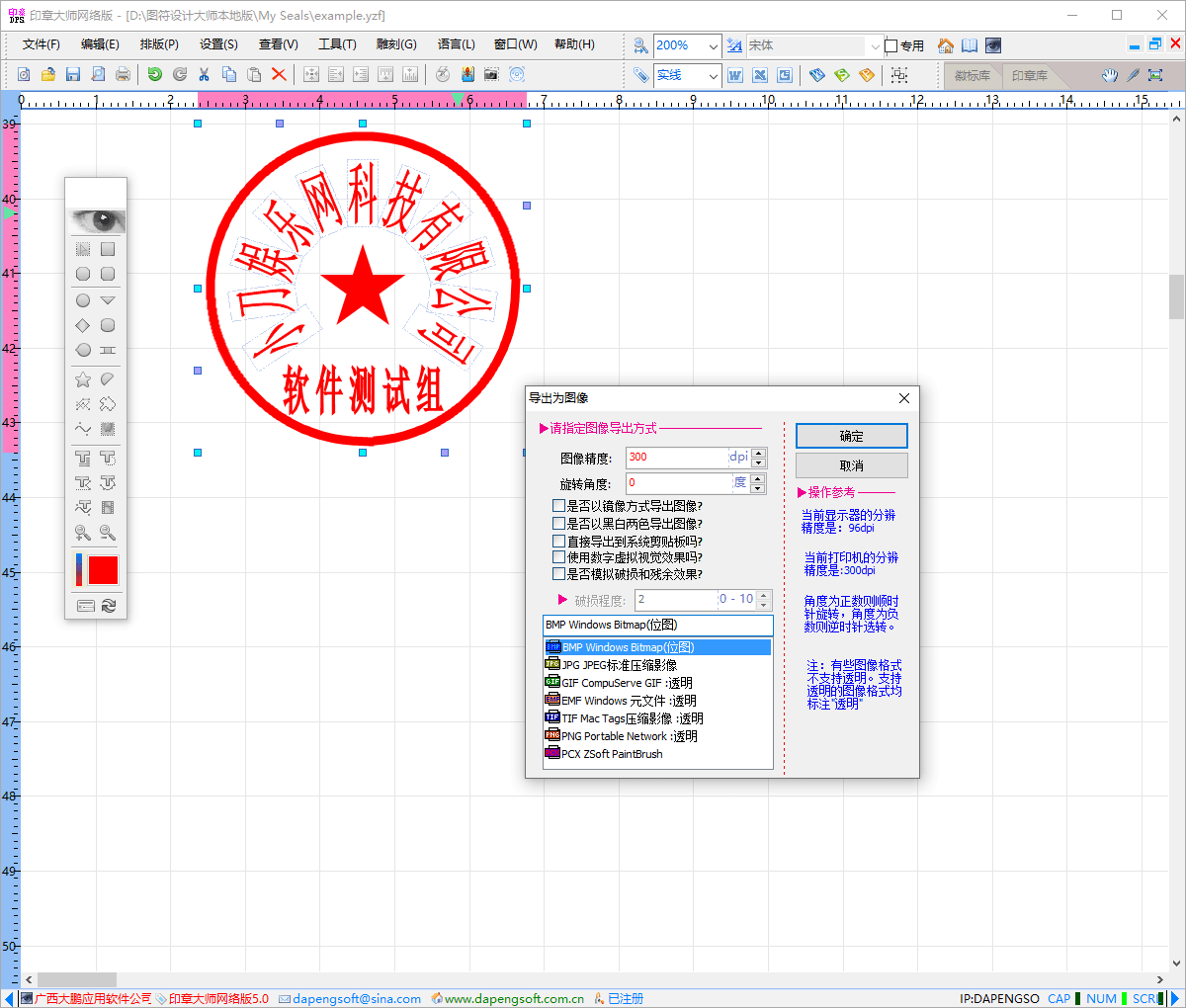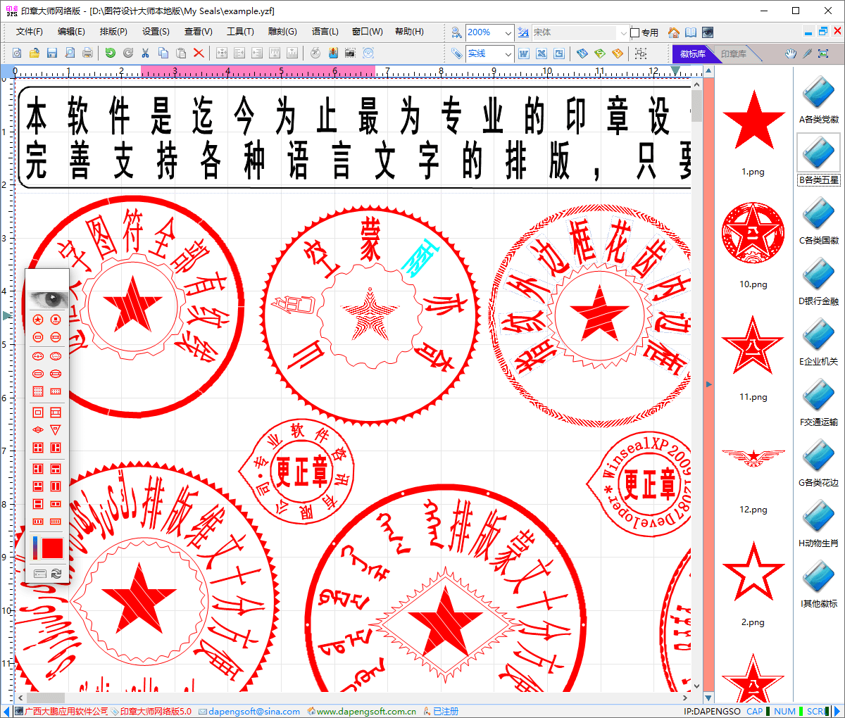 这是一款制作各种专业级印章的辅助软件。自带徽标图案库,包括:艺术印章、公章、私章、阳章、阴章等形式,可以将多个不同效果的印章组合成复杂印章,支持各种打印机输出。