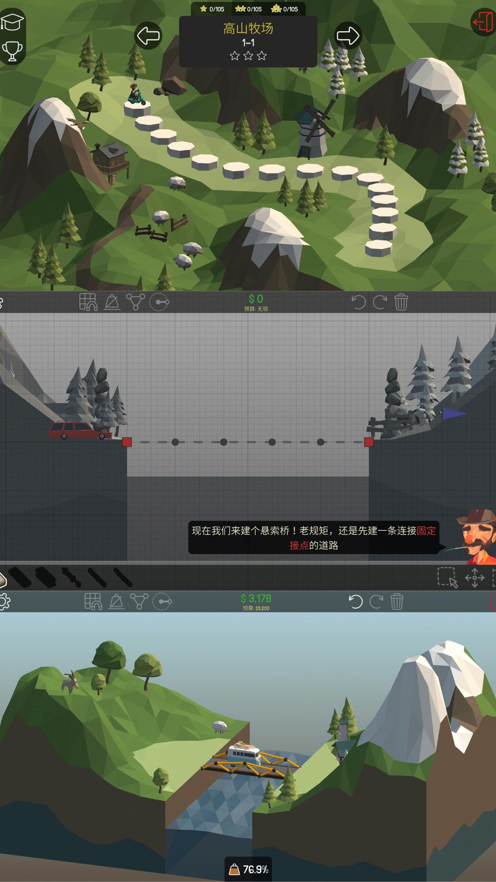 这是一款基于物理引擎的桥梁建造类模拟经营游戏,比起前作增加了众多全新的场景以及道具,全新的力学等待你来挑战,尝试运用不一般的方法通过一个个关卡,玩家们可以在草图上进行设计,为特技飞车建立踏板,为卡车建立足够结实的桥梁。已汉化!