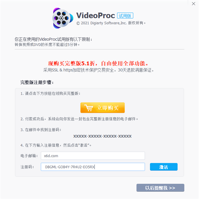 下载安装好之后启动->会提示你注册->输入邮件地址和下面的“许可密钥”激活即可